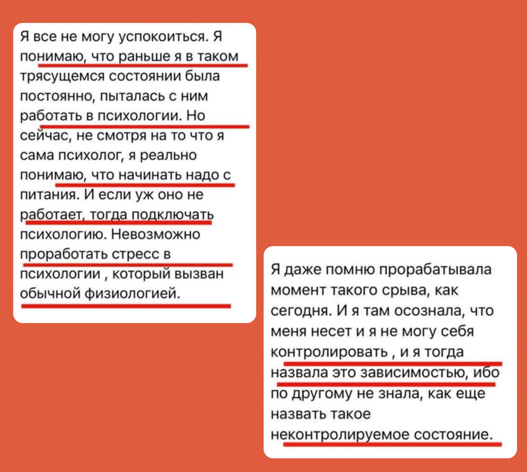 Моя работа строится на комплексном подходе, объединяющем знания нутрициологии и психологии пищевого поведения. Это важно, потому что разговоры о взаимоотношениях с едой невозможны без понимания физиологии и питания, но и одного нутрициологического подхода недостаточно, чтобы решить глубокие психологические вопросы, связанные с едой